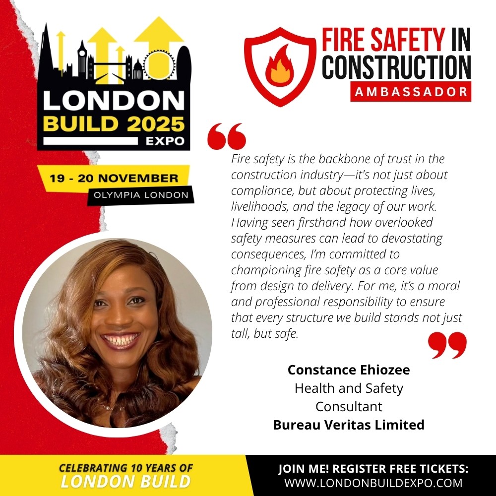 Dr Constance Ehiozee will be attending London Build 2025 as a Fire Safety Ambassador, engaging in deeper conversations about the realities of fire safety in modern construction and the evolving regulatory landscape.